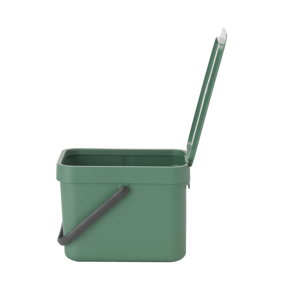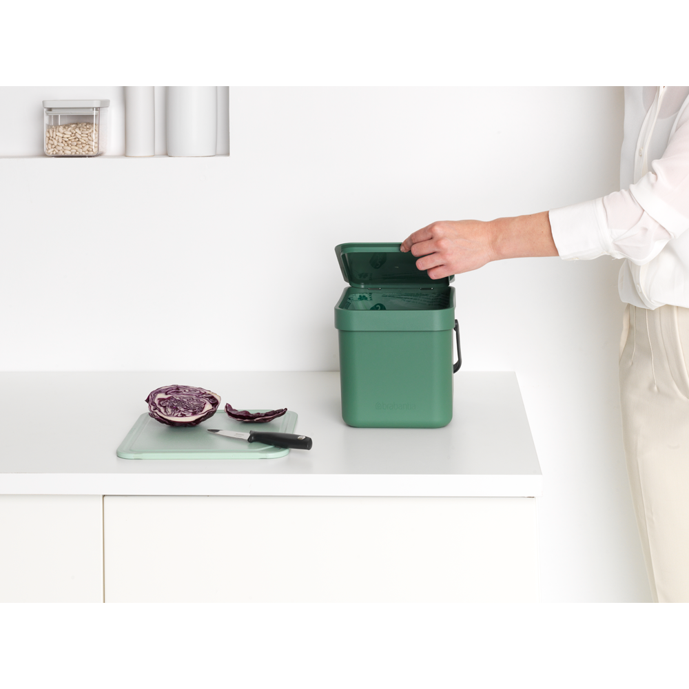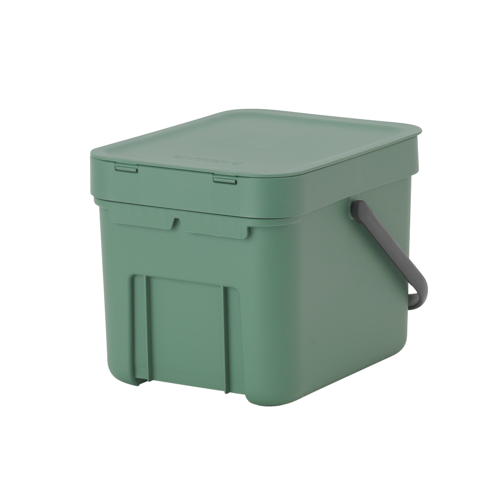 Este monísimo basurero Sort & Go para reciclar de 6 litros de Brabantia, cuya tapa se puede dejar en posición abierta, es ideal para las mondas, los restos, las sobras… y en realidad para cualquier resto orgánico de la cocina. No tienes más que colocarlo en la encimera, en un cajón o colgarlo de la pared con el soporte que trae incluido. Y cuando esté lleno, cógelo de su práctica asa y vacíalo. ¿Quieres además una bolsa a juego? Las bolsas PerfectFit, 100% compostables, código S, encajan a la perfección y son fáciles de poner. Tamaño XS, ayuda XL.