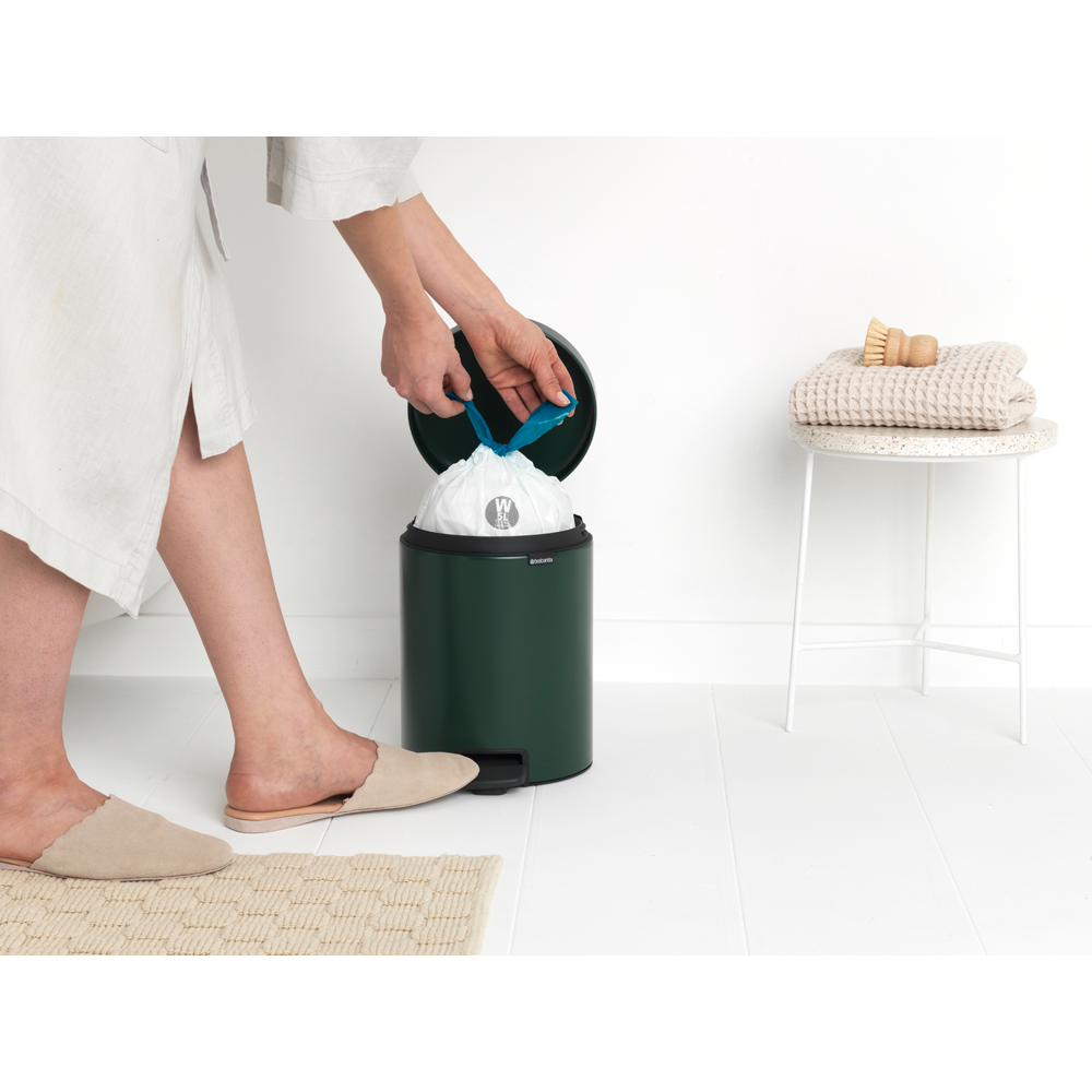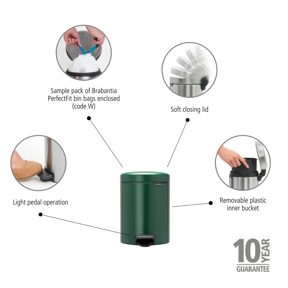 El basurero de pedal NewIcon de 5 litros de Brabantia no solamente es higiénico y elegante, sino que además es un gran aliado. Robusto, siempre permanece firme gracias a su base antideslizante y su bloqueo anti-balanceo. La tapa se cierra herméticamente a prueba de olores. Se abre con tan sólo un ligero toque en el pedal y se cierra suavemente. Un pequeño toque de diseño atemporal para el baño, el aseo, el cuarto del bebé o cualquier otra otra estancia donde puedas usar un pequeño gran basurero.