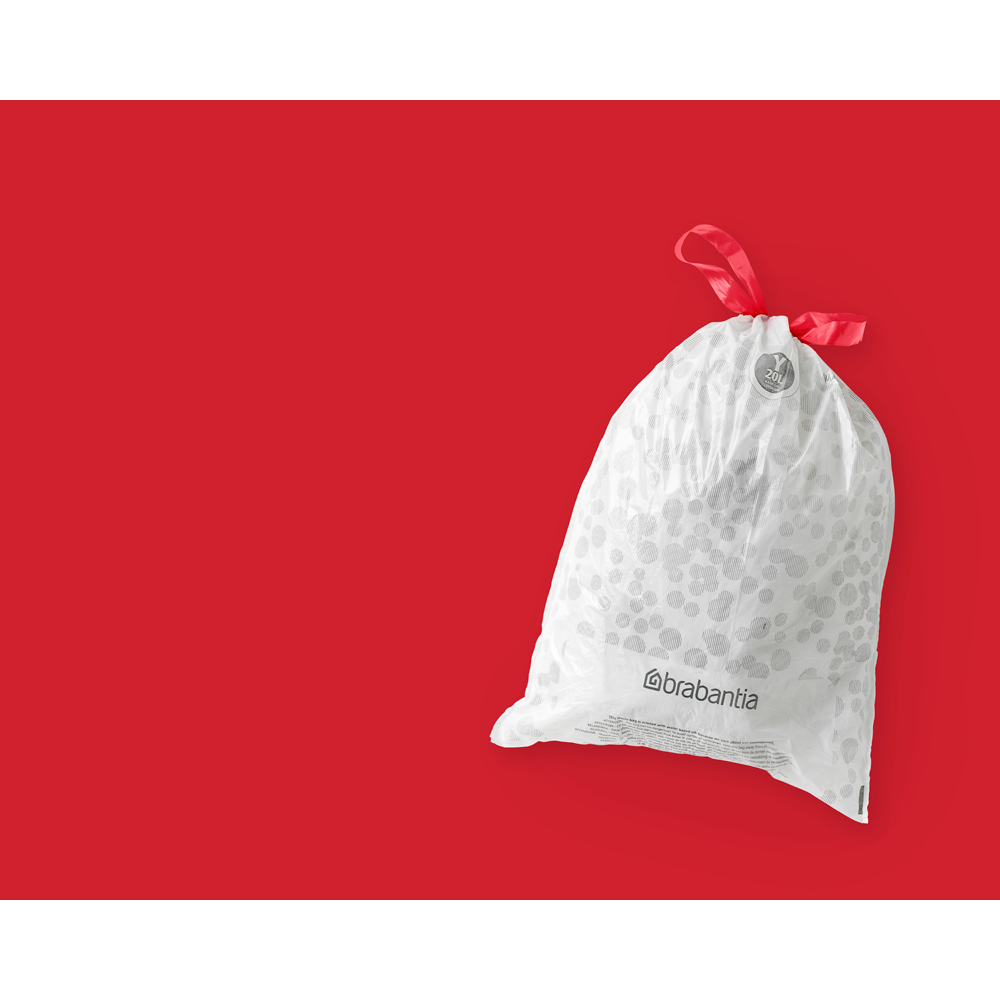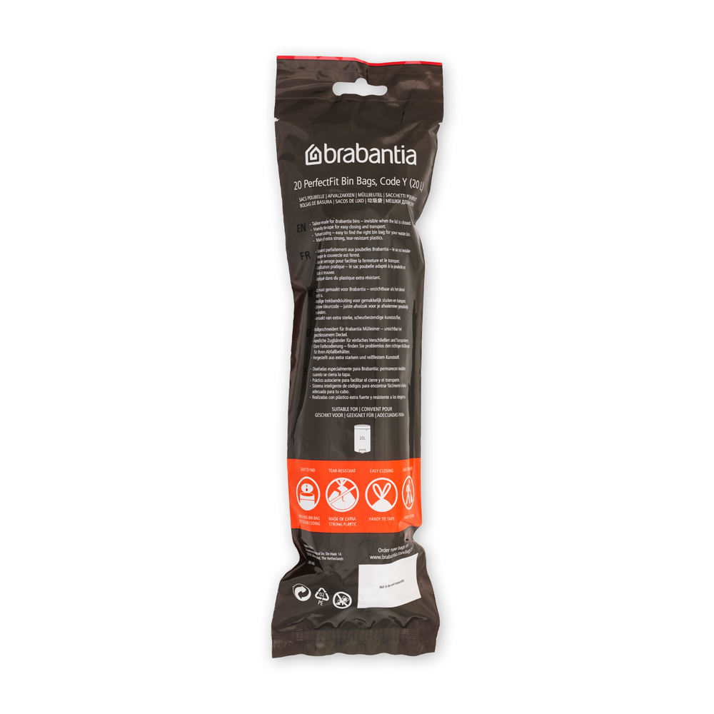 Las bolsas de basura PerfectFit de Brabantia se adaptan a la perfección a tu basurero de basura Brabantia, al igual que a tu ajetreada vida. ¡Y es que son súper resistentes y disponen de una práctica cinta de cierre! Sólo tienes que tirar de ella para sacar la bolsa del basurero y cerrarla. ¿No estás seguro de qué tamaño necesitas? Comprueba el código de color que figura en el interior de la tapa de tu basurero. Grandes bolsas que se adaptan a la perfección a tu basurero Brabantia.