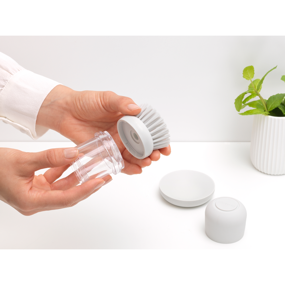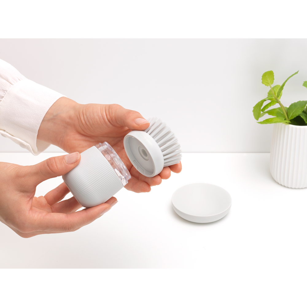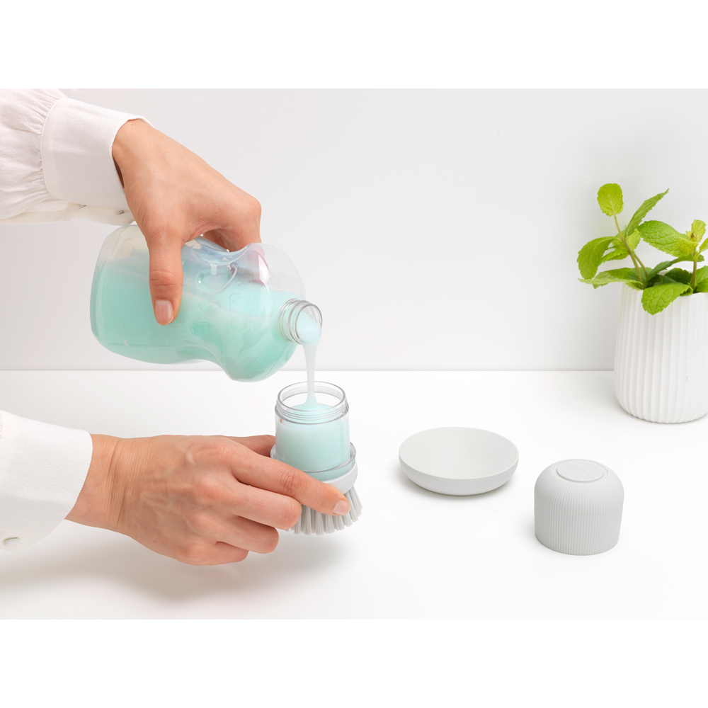 Fregar los platos es la mar de fácil con este cepillo SinkSide de Brabantia con dispensador de jabón. Pulsa el botón para sacar la cantidad de líquido lavavajillas que necesites y a fregar. Las cerdas duraderas de poliéster son lo suficientemente sólidas para fregar y lo suficientemente suaves como para no rayar. Y cuando hayas acabado puedes colocarlo en su soporte inteligente. Un gran compañero para las tareas de limpieza.
