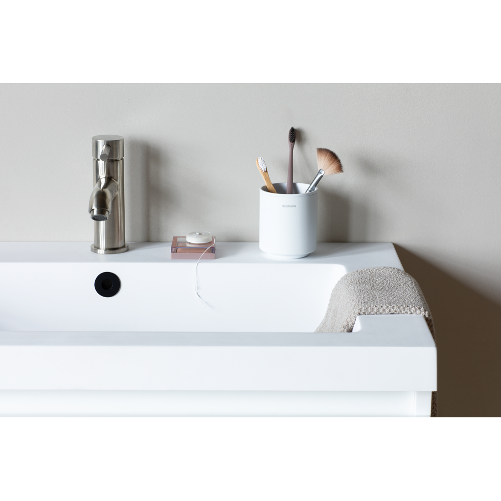 ¿Quieres tener el lavabo organizado? Este robusto y estable vaso para cepillos de metal MindSet de Brabantia guarda tus cepillos de dientes y la pasta juntos, rectos, secos y limpios. ¡Y también es perfecto para cepillos eléctricos!