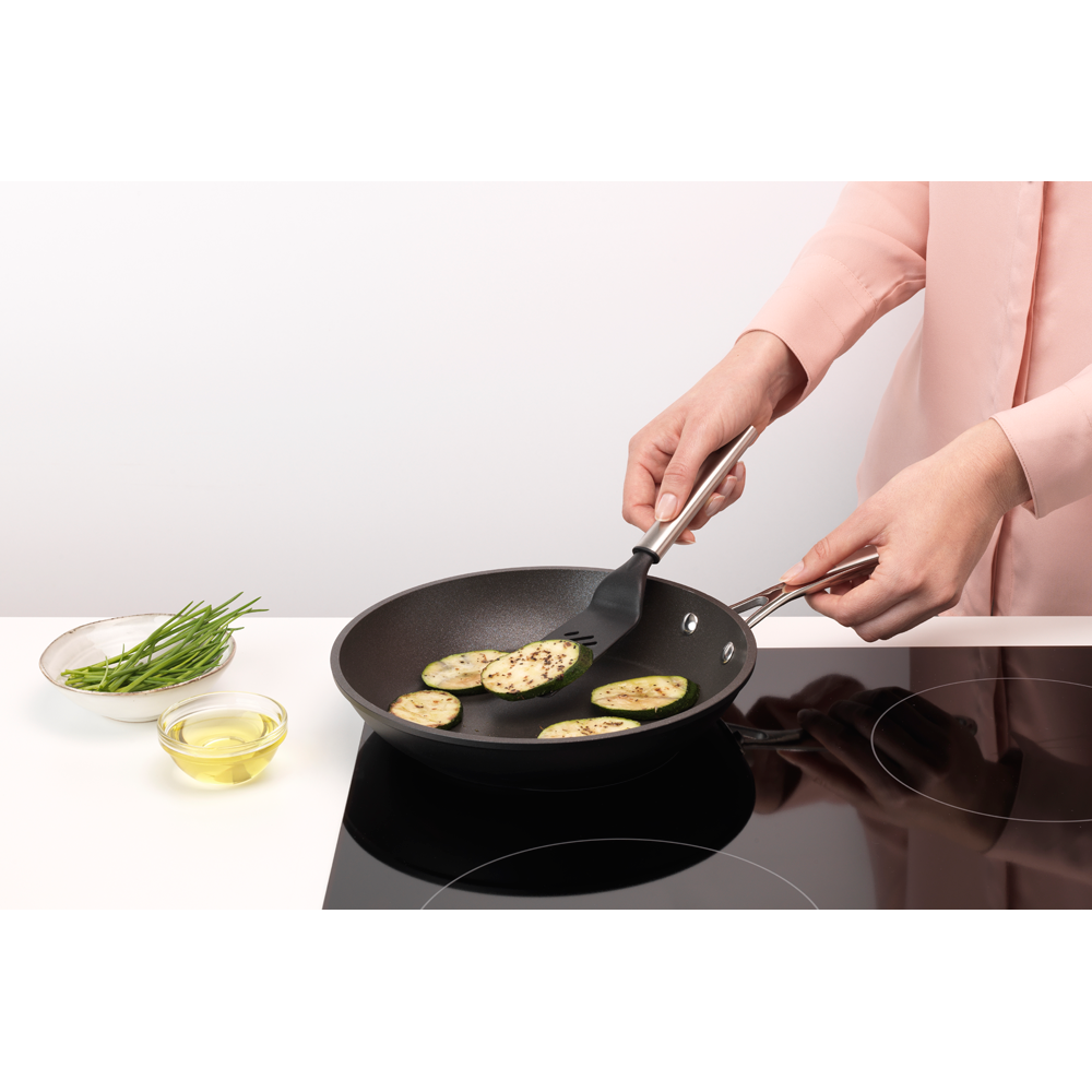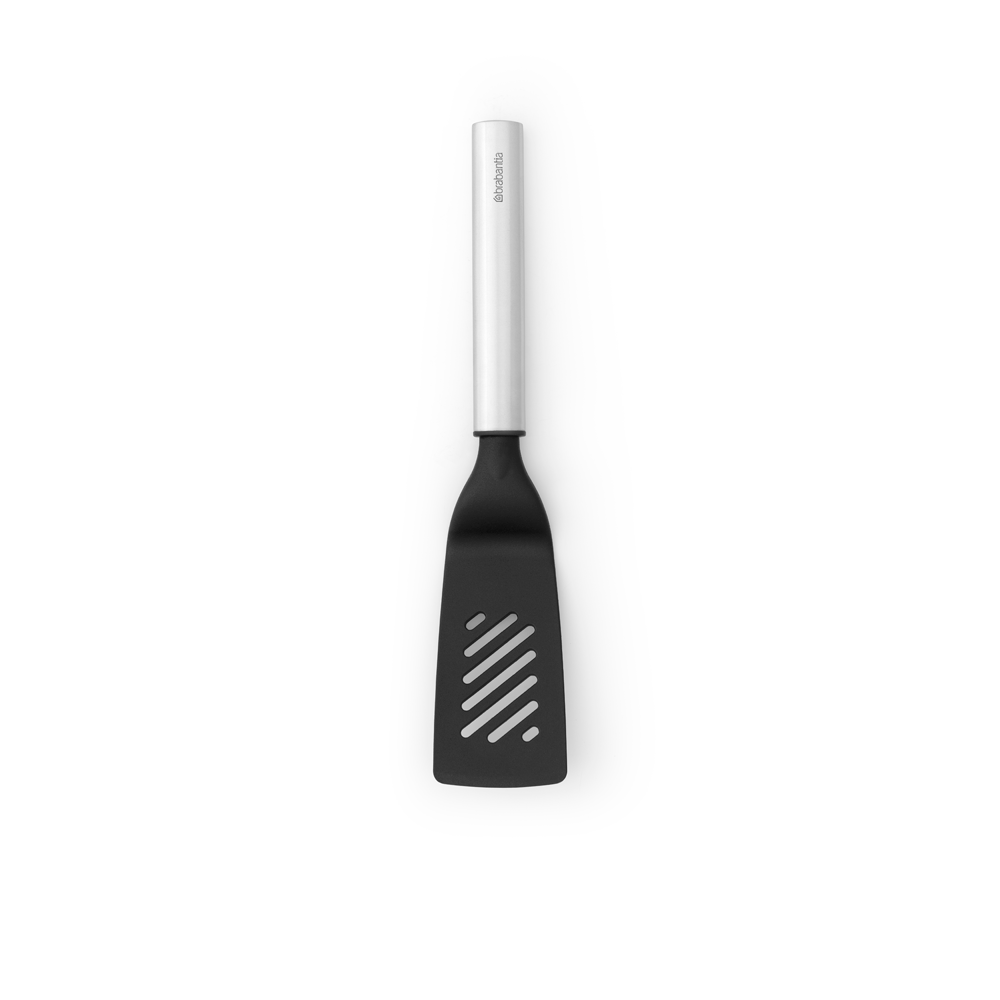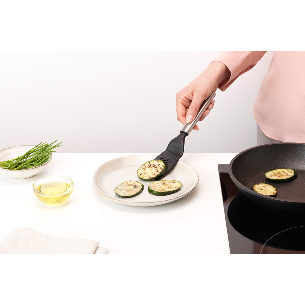 ¿Quieres darle la vuelta a la hamburguesa o repartir las verduras por la sartén? En ese caso, utiliza esta espátula antiadherente de tamaño pequeño de Brabantia. Esta espátula dispone de unas ingeniosas ranuras que escurren la grasa con facilidad, lo que la hace perfecta para servir. Además, está fabricada con nailon resistente que no daña el menaje. ¿Qué tal si damos una vuelta?