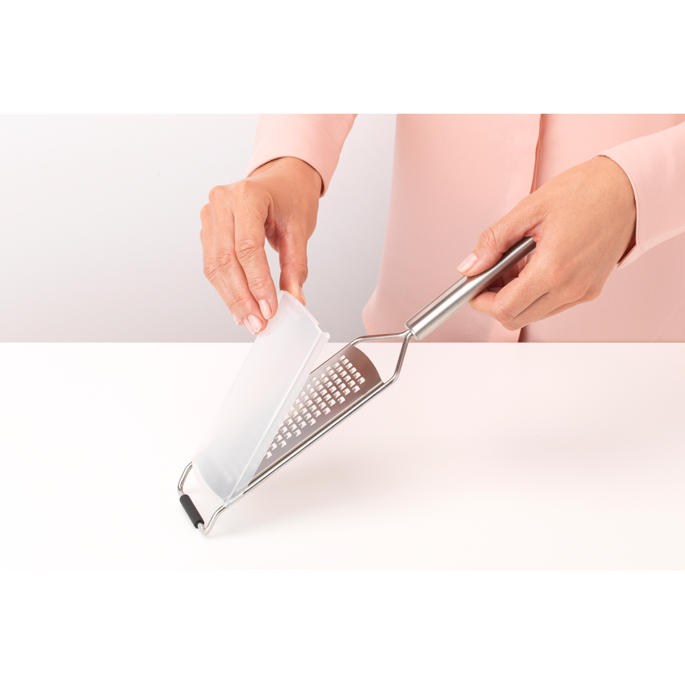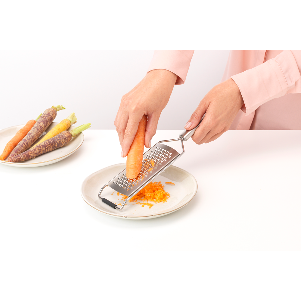 Consigue sabores más intensos rallando ingredientes frescos. Escoge tu ingrediente favorito: repollo, manzanas, queso blando, calabacín, zanahorias…Este rallador grueso de Brabantia puede con todo. Permite rallar sin esfuerzo gracias al mango antideslizante y a la amplia hoja. Y cuando hayas acabado, puedes guardarlo de forma segura gracias a su funda protectora. ¡Menudo rallador!