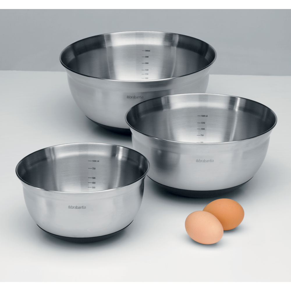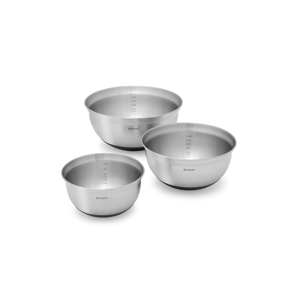 ¿Disfrutas mezclando y batiendo en la cocina? Hazlo con estilo gracias a este set de Fuentes para mezclar de 1, 1,6 y 3 litros Profile de Brabantia fabricados en acero inoxidable. La escala de medida impresa en el interior permite mezclar los ingredientes con facilidad y por fuera rezuma estilo. Su borde ligeramente curvado ha sido diseñado para mantener el Fuente en la posición de mezclado idónea, mientras que la base de silicona impide que el Fuente se deslice. Resistente al calor hasta 220º. ¡Menudo súper set de Fuentes!