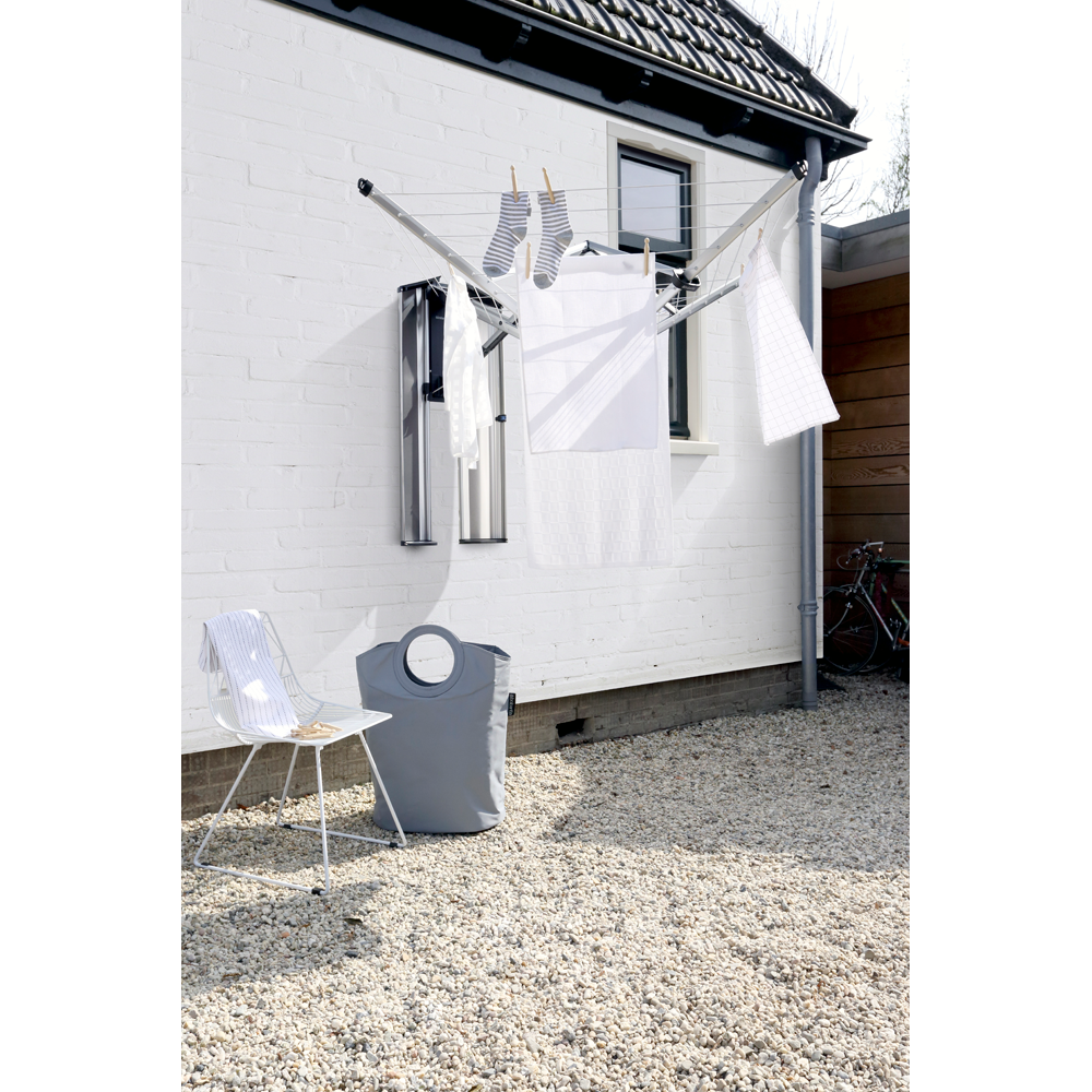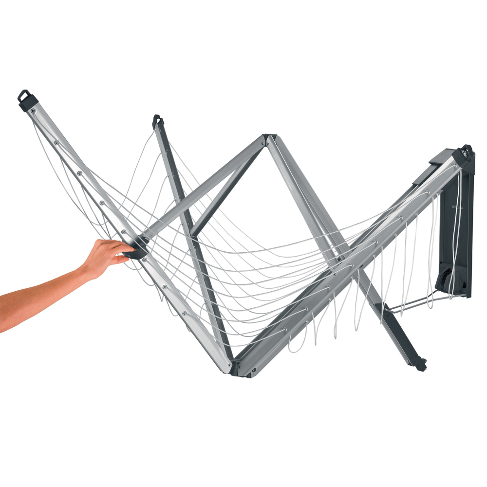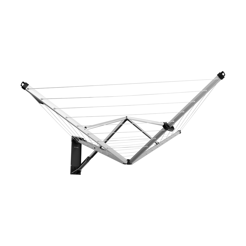 ¡Ahora ves el tendedero, ahora no! El tendedero WallFix de Brabantia desaparece cuando no lo usas. Pero puedes extenderlo con tan sólo una mano y te proporcionará espacio suficiente para tender toda la colada de una lavadora completa, incluso prendas de gran tamaño, ya que las cuerdas exteriores miden 120 cm. Todas las cuerdas son de primera calidad, resistentes a los rayos UV y antideslizantes, para que la colada se quede en su sitio. Pídelo, fíjalo a la pared con la plantilla de perforacion y acabarás de una vez por todas con el rompedero de cabeza de dónde tender la colada.