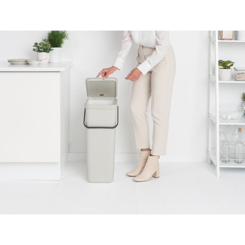 Tira los envases, botellas y latas vacías -y cualquier otra cosa que te venga bien- en este práctico basurero para reciclaje Sort & Go de 40 litros de Brabantia. Encaja perfectamente en una esquina o contra la pared y está provisto de una gran asa para transportarlo y vaciarlo. ¡Justo lo que necesitas para no comerte el coco con el reciclaje del hogar!
