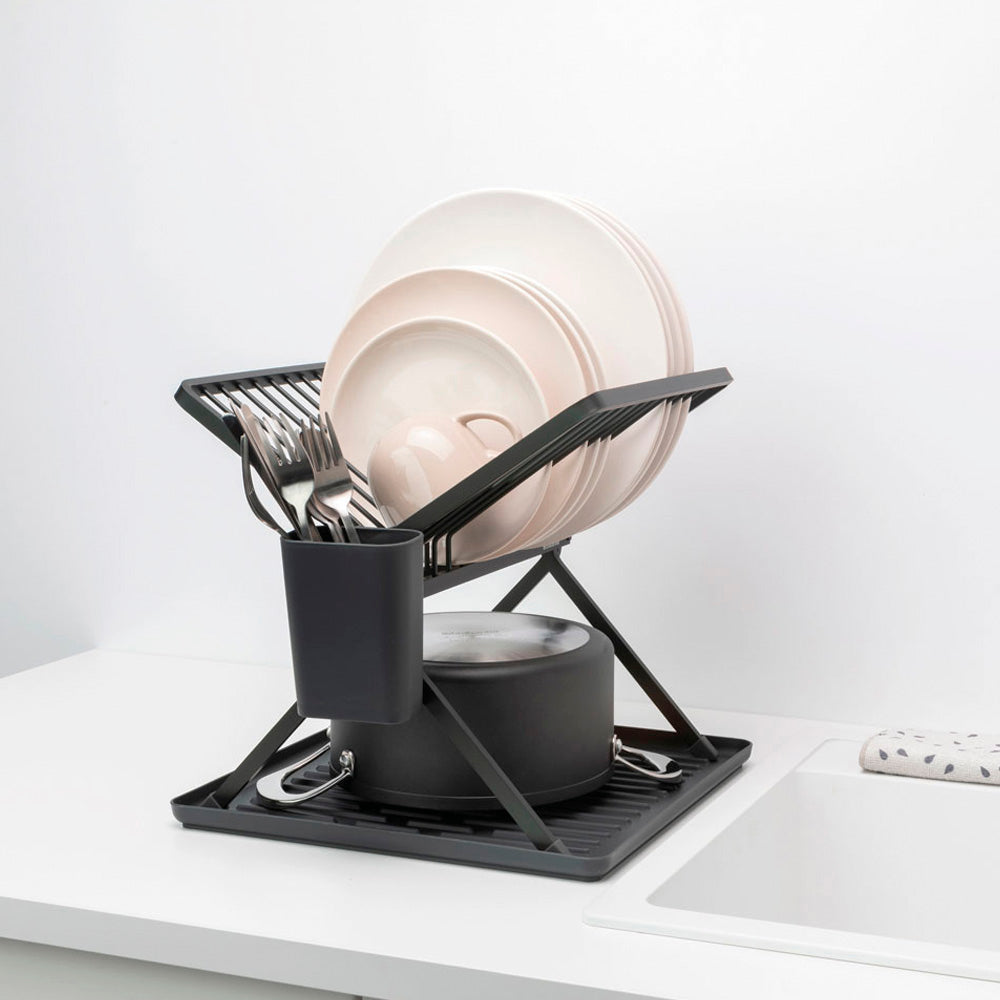 Los platos no se lavan solos, ¡pero sí que se secan solos! Este Secaplatos plegable SinkSide de Brabantia con bandeja recogegotas tiene espacio para hasta 13 platos o sartenes, ollas y cristalería. El recipiente para cubiertos y utensilios se puede quitar, por lo que resulta más sencillo plegar el Secaplatos y guardarlo. Es lo suficientemente bonito como para dejarlo permanentemente en la cocina, pero también lo suficientemente compacto para almacenarlo donde quieras - ¡una auténtica pasada!